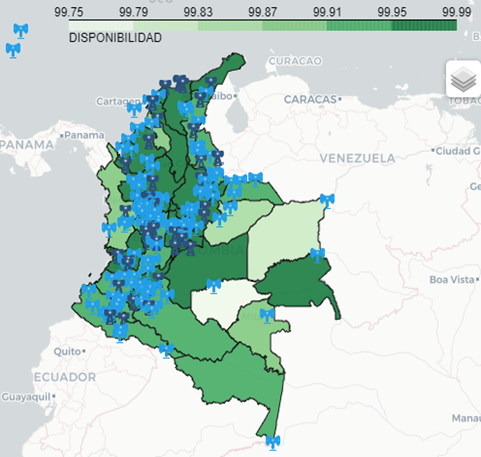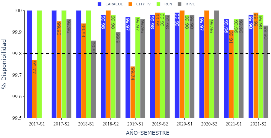 Para el grupo de las estaciones con cobertura mayor a 100.000 habitantes se observa que prácticamente el total de las mediciones puntuales están dentro del rango de calidad en la disponibilidad a lo largo de los 5 años 2017-2021, es decir, con valores mayores o iguales a 99,8%, con tres excepciones específicas: en el primer semestre de 2017 y 2019 se registró una estación de CityTV que tuvo una disponibilidad ligeramente por debajo del valor objetivo; así mismo, en el primer semestre de 2021 se registró un sitio en Abrego (Norte de Santander) con disponibilidad de 99,78%, perteneciente a RCN y a CARACOL.
