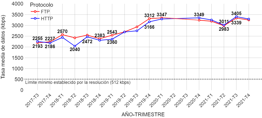 A partir del 2019-4T en adelante las velocidades promedio por trimestre se mantuvieron por encima de 3 Mbps y se alcanzaron picos máximos históricos en 2021, especialmente en pruebas HTTP donde se registró un valor de 3,4 Mbps en 2021-T3, y en ese mismo trimestre con FTP se registró un pico de 3,3 Mbps (Ver Gráfico 10). Es importante tener en cuenta que el valor objetivo mínimo establecido en la regulación es de 512 Kbps (equivalente a 0,5 Mbps).