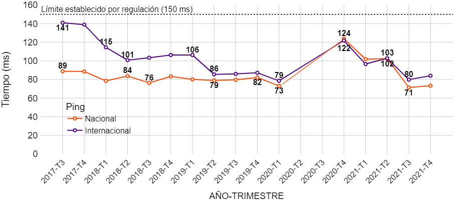 En los tiempos de respuesta mediante Ping se observa una mejoría a lo largo de la serie histórica, especialmente en el Ping internacional. No obstante, en el 2020-T4 se produjo una afectación atípica en los tiempos al registrar picos promedios entre 122 ms y 124 ms de Ping, cuya alza coincide con el periodo de la pandemia por COVID-19.