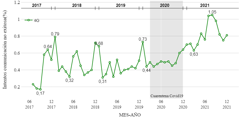 Por su parte, para 3G se registró un promedio en el 2021 de 1,07%, lo que reafirma una tendencia lineal en aumento (leve disminución en la calidad) con incrementos de 0,12 puntos porcentuales cada año desde el 2017 al 2021.