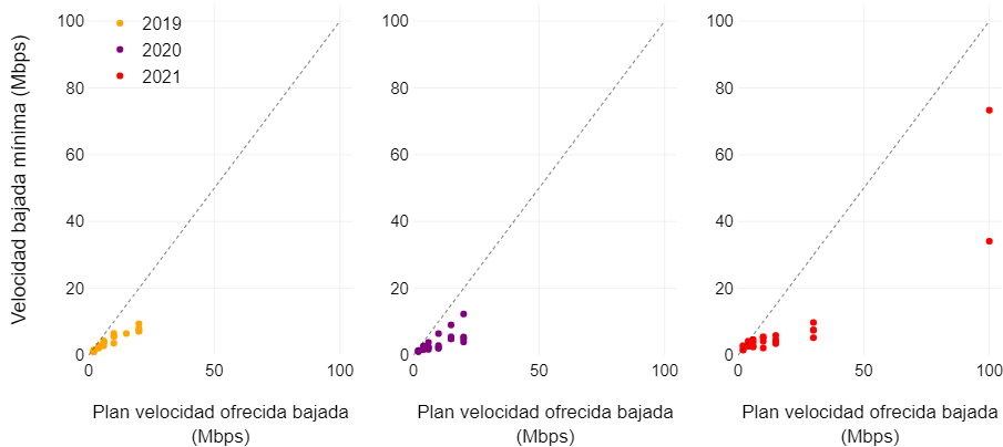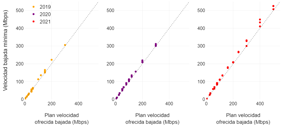 El presente análisis se enfoca en el indicador de velocidades mínima medidas para la descarga de archivos y su comparación con las velocidades ofertadas por el operador. Al comparar los años 2019, 2020 y 2021, se observa un crecimiento en las velocidades de bajada (o descarga) ofertadas contractualmente para internet fijo y esto se refleja en un aumento de las velocidades medidas.