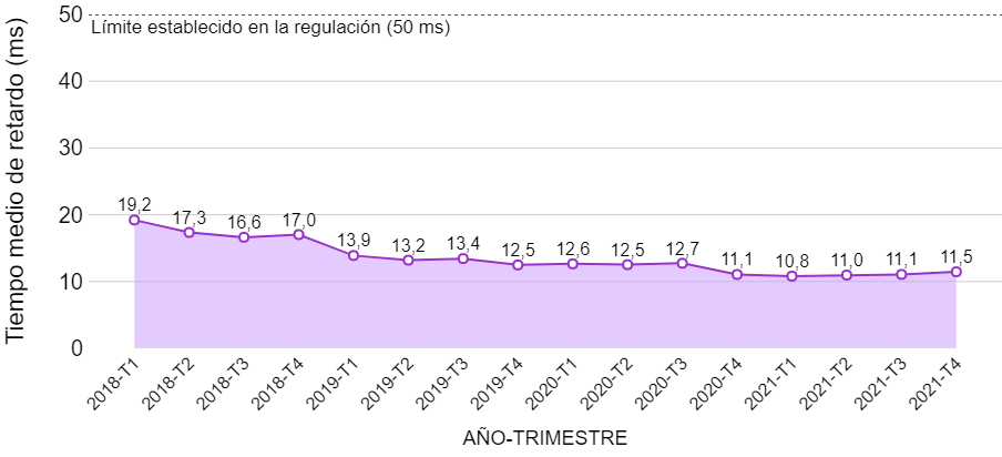 Los valores registrados para el indicador de retardo medio han estado por debajo del valor objetivo con un amplio margen (un valor menor o igual que 75 ms se considera dentro del rango de calidad.), dado que el mayor valor medido desde el 2017 al 2021 ha sido de 30 ms.