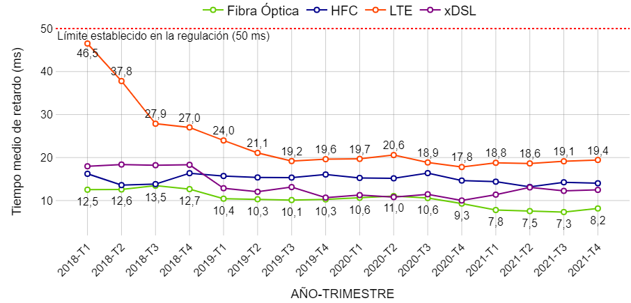 Así, durante el periodo comprendido entre 2018-1T y 2021-4T, las variaciones por tecnología fueron: i) En la tecnología LTE se redujo el retardo promedio en un 58%, al pasar de 46,5 a 19,4 ms; ii) en la tecnología xDSL se redujo el 31%, al pasar de 18,0 a 12,5 ms; iii) en Fibra Óptica se redujo el 35%, al pasar de 12,5 a 8,2 ms; y finalmente, sin variaciones significativas se encuentra que, iv) en HFC el indicador promedio ha estado oscilando alrededor de los 15 ms a lo largo de estos 3 años, con variaciones inferiores a ±2 ms.
