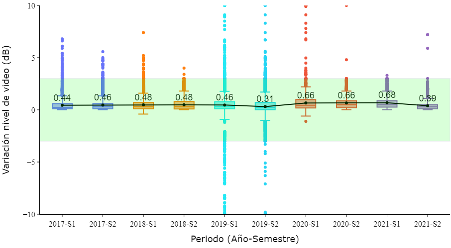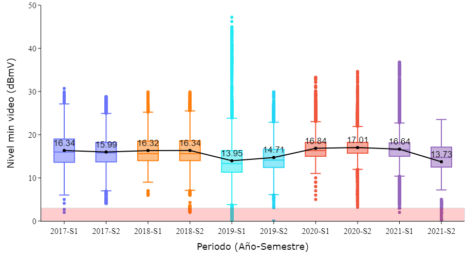Durante los 10 semestres transcurridos desde el 2017 al 2021 todos los promedios del nivel mínimo de portadora de vídeo han estado por encima de 13 decibeles por milivoltio (dBmV).