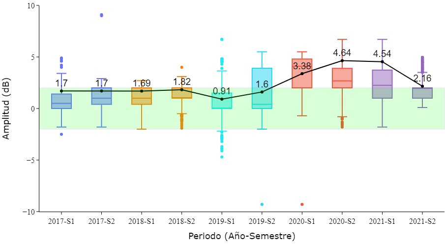Durante los semestres comprendidos entre 2017 al 2019 el promedio semestral de Amplitud permaneció con valores positivos menores a 2 dB, dado que la mayoría de los operadores registraron más del 99% de las mediciones del indicador dentro del rango de ±2 dB.