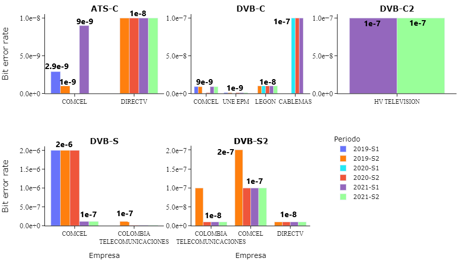 Por su parte, la tecnología satelital DVB-S2 es utilizada por 3 operadores, en donde DirecTV ha mantenido su indicador en un máximo de 1x10-8, es decir, dentro del rango de calidad; y se observan mejorías en los operadores Colombia Telecomunicaciones y Comcel en 2020 con respecto al 2019, dado que a partir del 2020 el 100% de las mediciones se encuentran por debajo del límite máximo objetivo para la Tasa de Error de Bits.