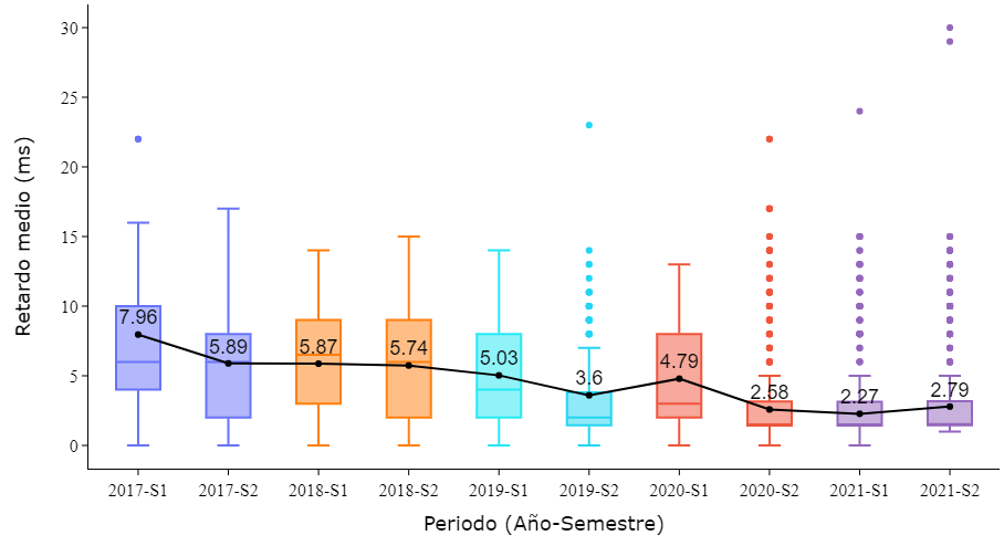 Además, el mapeo de estas mediciones a lo largo del tiempo muestra una tendencia de mejora en varios aspectos; por una parte, se registró en los segundos semestres de 2020 y de 2021 un promedio de 3,22 ms, el cual es menor que en los demás períodos, y por otra parte, los valores en dichos semestres se encuentran menos dispersos que en otros periodos, tal como se aprecia con el diagrama de cajas presentado en el Gráfico 29.