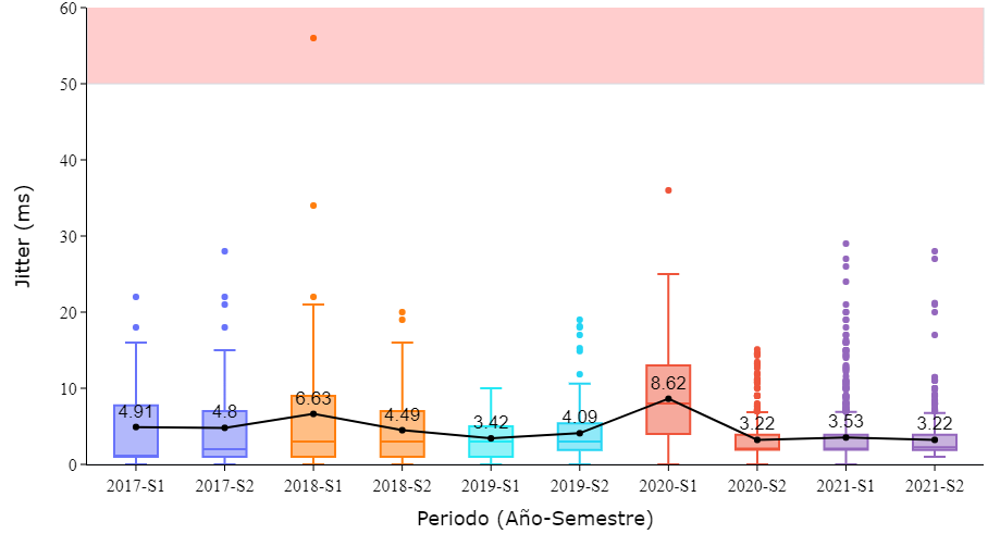 Los valores reportados del indicador Jitter se encuentran por debajo del valor objetivo máximo, es decir, dentro del rango de mejor calidad (un valor menor o igual a 50 ms se considera dentro del rango de calidad).