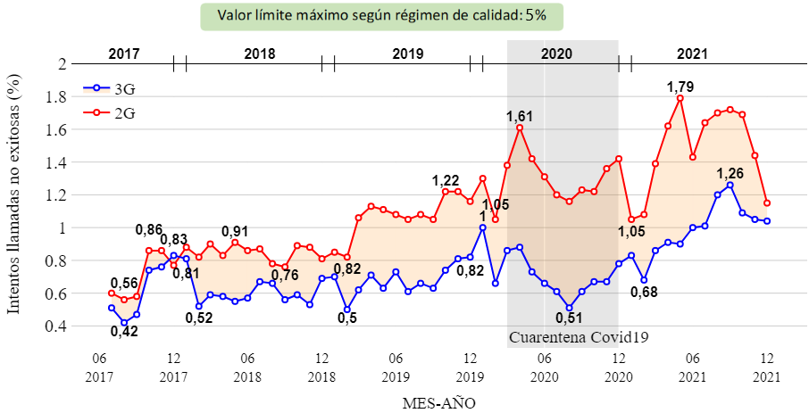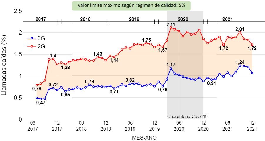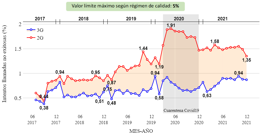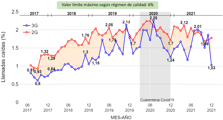 Durante el tiempo transcurrido entre julio de 2017 y diciembre de 2021, el porcentaje promedio mensual de llamadas caídas entrantes y salientes tanto en tecnologías de acceso 2G como 3G se ha mantenido por debajo del valor objetivo1 máximo del indicador contemplado en la regulación para cada nivel de agregación.