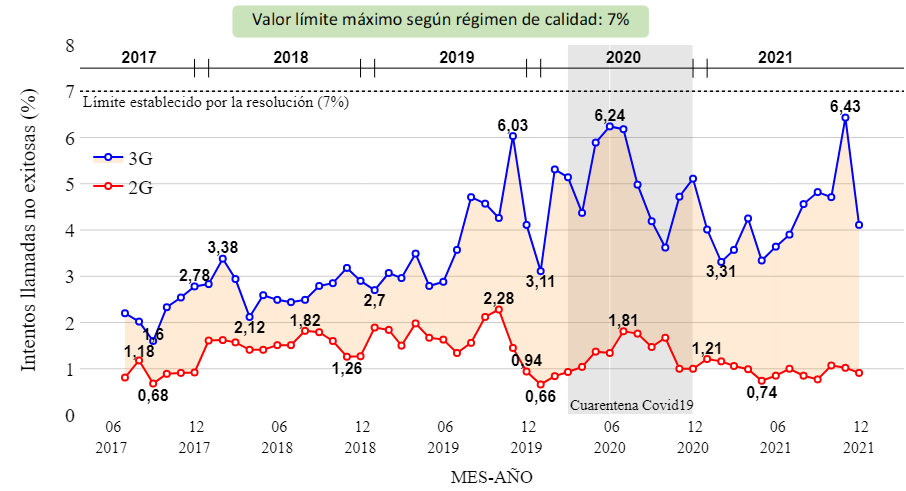 Así, el promedio del año 2021 para 3G fue de 0,62% de llamadas caídas, lo que representa un aumento de 0,18 puntos porcentuales con respecto al 2020; mientras que el promedio para 2G fue 1,37% en 2021, lo que representa un incremento de 0,07 puntos porcentuales respecto al 2020.