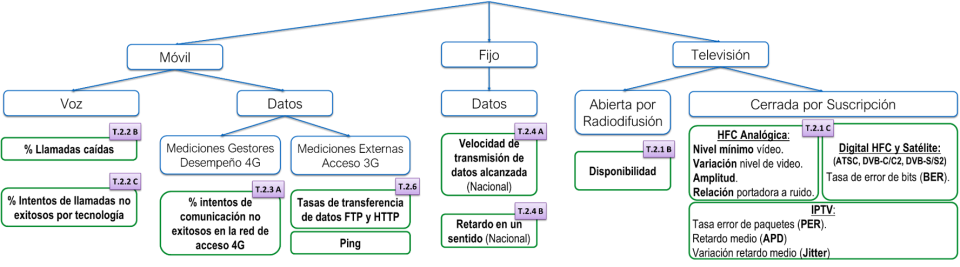 Con el fin de establecer condiciones regulatorias que incentiven la mejora continua en la prestación de servicios de telecomunicaciones con calidad a los usuarios en todo el país, y a la vez impulsar la inversión en el despliegue de nuevas tecnologías e incrementar su oferta en todo el territorio nacional, la Comisión estableció el régimen de calidad de servicios de telecomunicaciones, definiendo mediciones periódicas de ciertos parámetros de desempeño que permiten evaluar su comportamiento de cara a los usuarios finales. En este sentido, se definieron indicadores de calidad para los servicios fijos de datos, móviles de voz y datos, y de televisión abierta y cerrada, tal como se resume en el Gráfico 1.