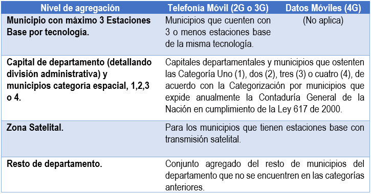 A partir de las mediciones reportadas por los proveedores, se cuenta por una parte con los indicadores para los servicios que se prestan a través de redes móviles, abarcando voz y datos, desagregados en diferentes ámbitos geográficos, según grupos de municipios o zonas, de la siguiente manera: