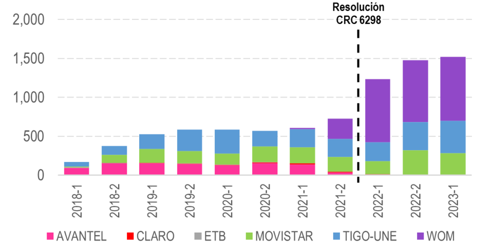 Por último, para el servicio de datos, el mayor volumen de tráfico en RAN se concentra en las siguientes ciudades: Bogotá, Medellín, Cali, Villavicencio y Cartagena; siendo WOM el operador con una mayor participación de tráfico de RAN en estas ciudades. Para las 5 ciudades se presentó un decrecimiento del tráfico mayor al 80% en el 2023-1S respecto del 2022-1S.