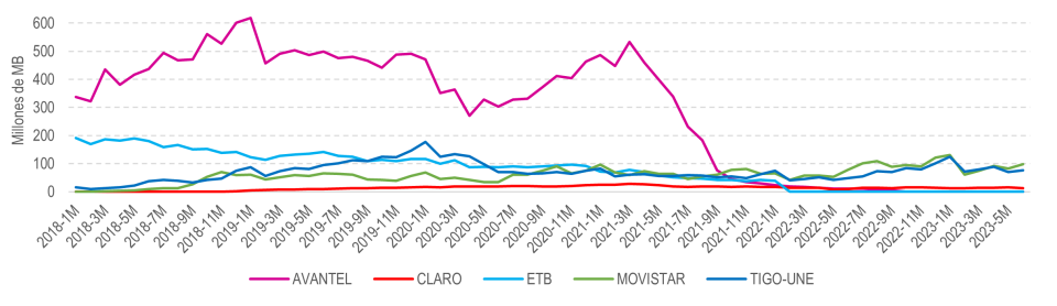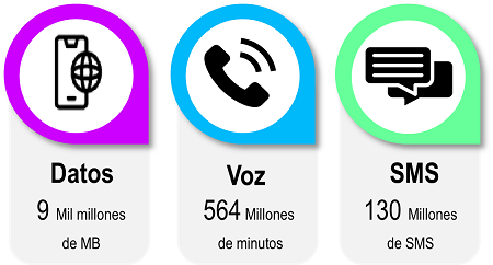 Para el 2023-1T el tráfico de RAN para el servicio de datos presentó una variación negativa de 1,2% frente al trimestre inmediatamente anterior. Así mismo, los tráficos de RAN del servicio de voz y SMS presentaron variaciones negativas de 5,7% y 8,3%, respectivamente, para el mismo periodo de análisis. Por otra parte, en comparación con el 2022-1T, los tráficos de los servicios de datos, voz y SMS presentaron variaciones negativas de 75,5%, 72,0% y 76,8%, respectivamente.