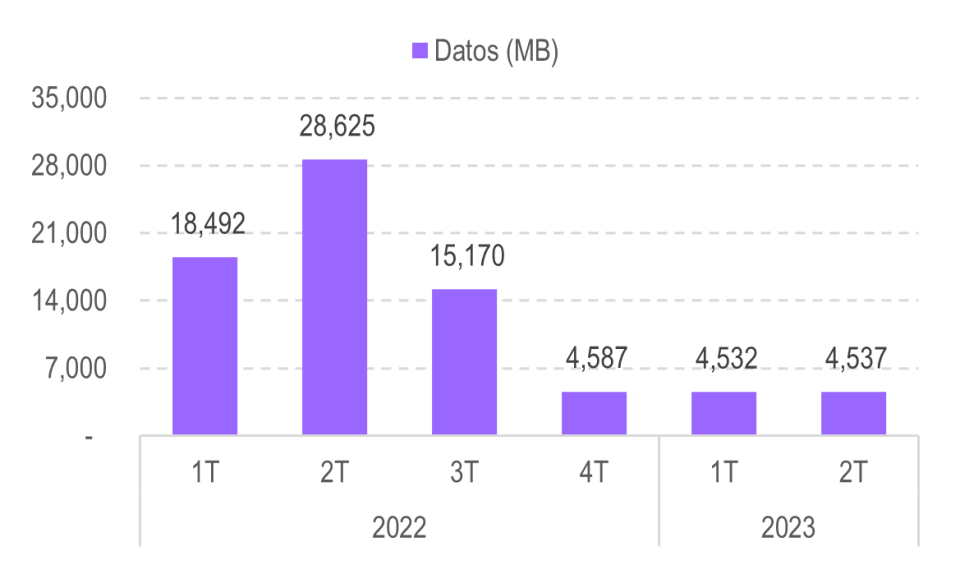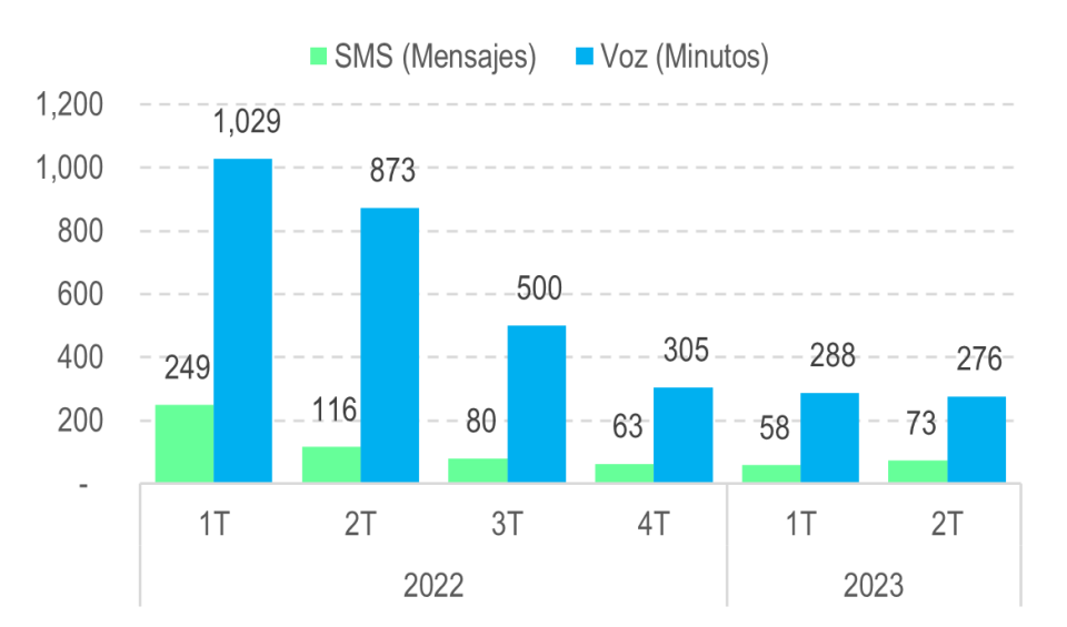 En el mismo período, el tráfico de RAN del servicio de SMS presentó una variación positiva de 25,3%, mientras que el servicio de voz presentó una disminución del tráfico de 4,0%. En comparación con el 2022-2T, se presentó una variación negativa para todos los servicios: 84,2% para datos, 37,3% para voz y 68,4% para SMS.