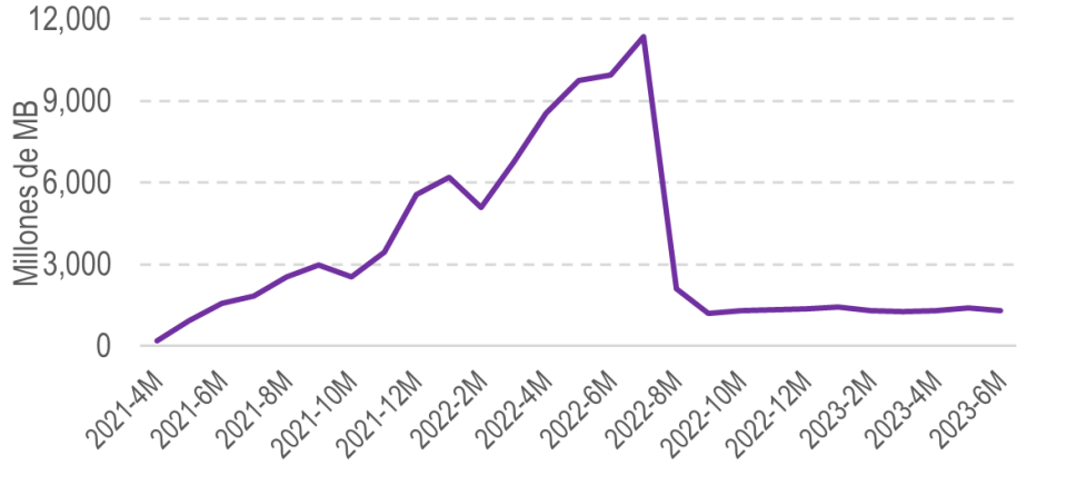 De otro lado, el tráfico de datos de WOM en RAN presentó una variación negativa del 99,2% para el 2023-1S comparado con el 2022-2S, al pasar de 46 mil millones a 8 mil millones de MB (ver Gráfico 4).