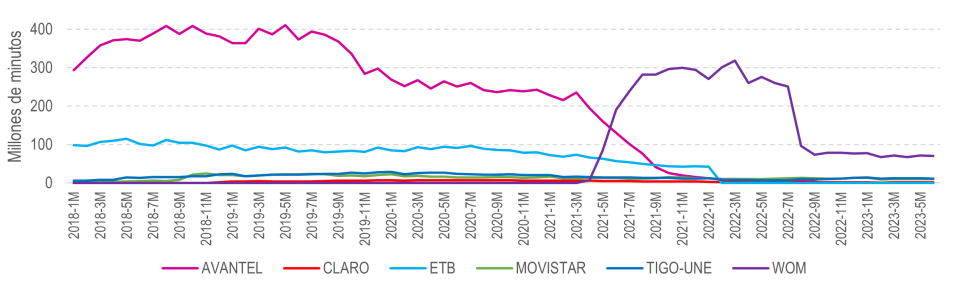 Con respecto al tráfico de voz, para el primer semestre del año 2023 se presentó una variación negativa del 70,3% frente al primer semestre del 2022, al pasar de 1,9 mil millones a 564 millones de minutos. Esta variación se explica principalmente por una contribución negativa de WOM con 66,3pp, ETB1 con 2,23pp y AVANTEL con 2,84pp. En cuanto a la participación por proveedor del tráfico de voz en RAN, en el primer semestre del 2023 el 75,1% correspondió a WOM, el 12,8% a TIGO, el 10,8% a MOVISTAR, y el 1,4% a CLARO.