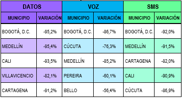 Respecto del tráfico del servicio de voz en RAN en el 2023-1S comparado con el 2022-1S, CLARO presentó la mayor variación positiva que corresponde al 72,4% en el departamento de Vichada, al pasar de 1,2 millones de minutos a 2,9 millones de minutos y la variación más negativa, equivalente al 99,7%, en la ciudad de Bogotá al pasar de 10,6 millones a 33 mil minutos.