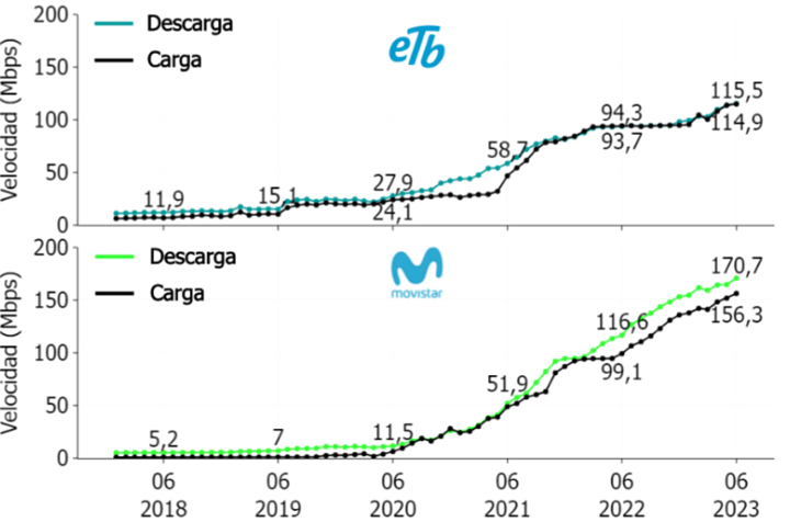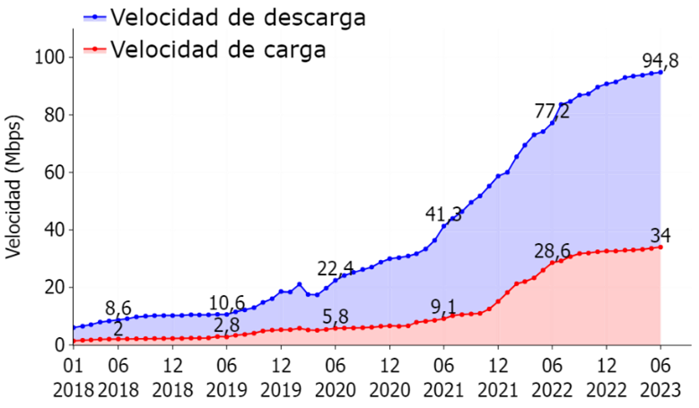 En particular, la velocidad de descarga aumentó un 22,8% frente a junio de 2022 y 129,5% con respecto a junio de 2021, mientras que la velocidad de carga tuvo incrementos del 18,9% y 273,6%, respecto de los mismos periodos mencionados anteriormente.