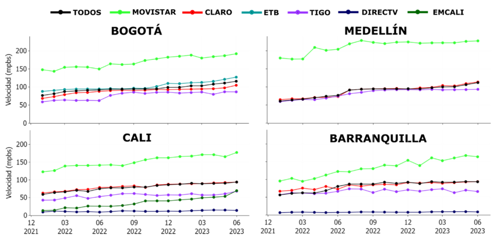 De las 4 ciudades analizadas, ETB únicamente presenta mediciones en Bogotá, en donde se observa que los valores de la velocidad de descarga son mayores que el agregado de todos operadores. EMCALI por su parte sólo reporta mediciones en Cali, con un crecimiento del 170% en la velocidad de descarga entre en junio de 2023 respecto al mismo periodo del 2022. DIRECTV está presente en Barranquilla y Cali, con la característica de ser el operador con las menores velocidades de descarga en ambas ciudades, que para el caso de Cali no superan los 15 Mbps, mientras que en Barranquilla el valor tope es de 9,3 Mbps.
