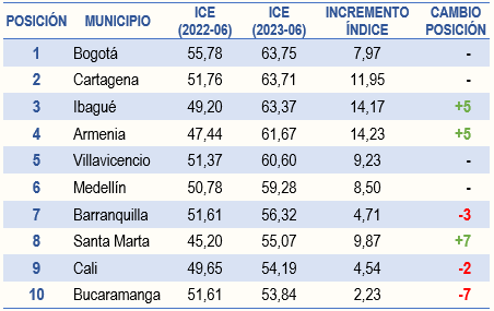 Comparando ambos periodos se observa que ninguna ciudad en el top 10 presentó disminución en su índice. Por otra parte, el cambio relativo de la posición fue mayor en Ibagué y Armenia, subiendo 5 posiciones respectivamente, mientras que Bucaramanga fue la ciudad que más posiciones bajó, pasando de la tercera posición en junio de 2022 a la décima en el mismo mes de 2023.