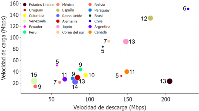 De acuerdo con lo anterior, se puede observar que, de los países analizados, Chile es el que presenta las mayores velocidades de descarga (229,48 Mbps) y carga (150,62 Mbps). La menor latencia la presentan Brasil, Ecuador y Uruguay con un valor de 5 ms.