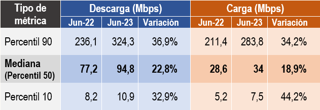 En la Tabla 1 se indican los valores de las velocidades para Colombia de diferentes tipos de métricas, en la que se puede observar, además de la mediana, los valores de los percentiles 10 y 90. Es así como, por ejemplo, para junio de 2023 el 10% de las mediciones se encuentra por encima de 323,3 Mbps para la velocidad de descarga y por encima de 283,8 Mbps para la velocidad de carga (percentil 90).