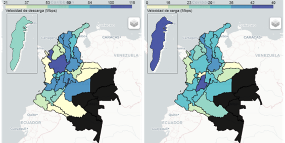 Por su parte, las velocidades de carga más altas se presentaron en Bogotá D.C. (48,7 Mbps), Tolima (45,8 Mbps) y San Andrés y Providencia (44,8 Mbps), y las más bajas nuevamente en Arauca (9,4 Mbps) y Caldas (15,7 Mbps).