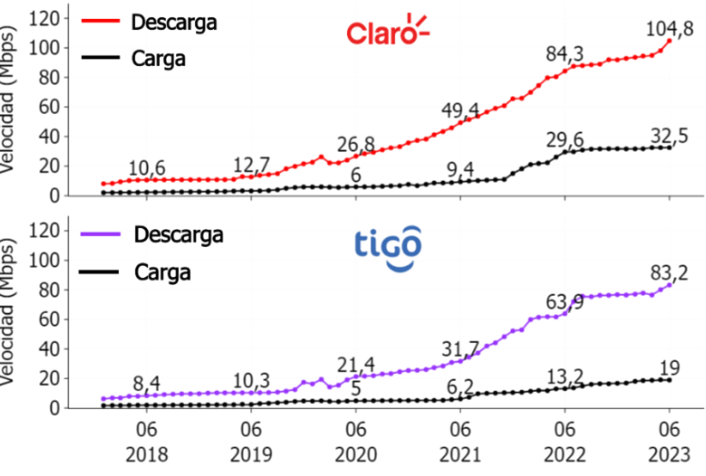 Respecto de CLARO se observa que la velocidad de descarga en junio de 2023 fue de 104,8 Mbps y la de carga de 32,5 Mbps, lo que corresponde a un aumento del 24,3% y del 9,8%, respectivamente, si se compara con el mismo mes de 2022. TIGO registró los menores valores de velocidad de los 4 operadores analizados, con 83,2 Mbps en descarga y 19 Mbps en carga en junio de 2023, lo que representa un incremento porcentual de 30,2% y de 43,9%, respectivamente, en relación con el mismo mes de 2022. Para estos dos operadores se evidencia que hay una asimetría entre las velocidades de descarga y de carga, por un factor de 3,2 para CLARO y de 4,4 para TIGO, en las mediciones de junio de 2023.