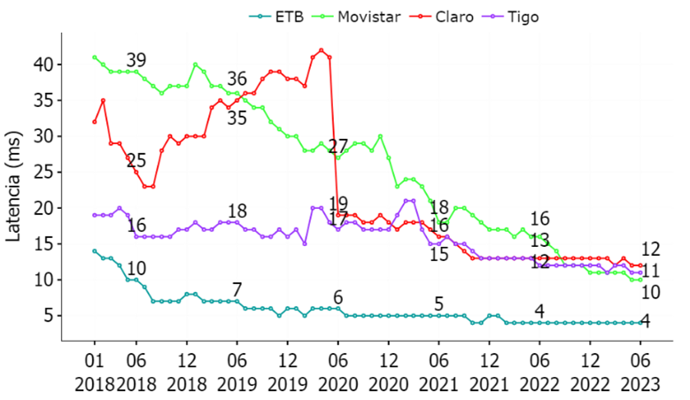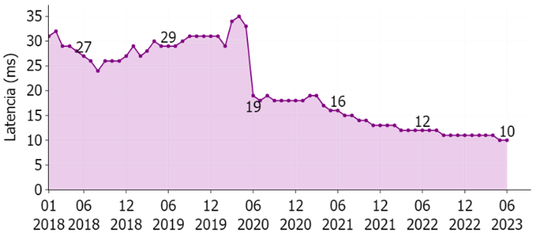 En cuanto a la latencia en junio de 2023, Arauca fue la ciudad con menor valor (4 ms), seguida de Bogotá y Cartagena con 7 ms. En términos relativos y absolutos, San Andrés presentó la mayor reducción en la latencia entre junio de 2022 y 2023 (70%), correspondiente a una disminución de 35 ms para llegar a un valor de 15 ms. Por su parte, Riohacha tuvo la mayor latencia en junio de 2023 con 33 ms.