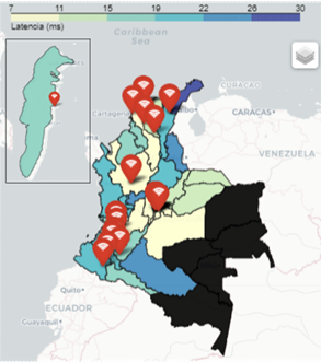 Finalmente, en el Gráfico 7 se muestra la distribución geográfica a nivel departamental de las mediciones de latencia en junio de 2023. Bogotá presenta las mejores latencias, con 7 ms, seguida de los departamentos de Bolívar con 8 ms, y Tolima, Cundinamarca y Atlántico con 9 ms. En contraste, los departamentos con las latencias más altas en el periodo analizado fueron La Guajira (30 ms), Caldas (25 ms), Norte de Santander (24 ms) y Caquetá (23 ms).