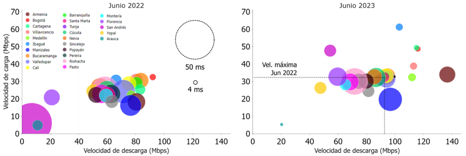 Los menores valores de velocidad de descarga en junio 2023 fueron para Arauca (20,3 Mbps) y Yopal (47,6 Mbps), mientras que para la velocidad de carga fueron Arauca (5,3 Mbps) y Manizales (19,7 Mbps).